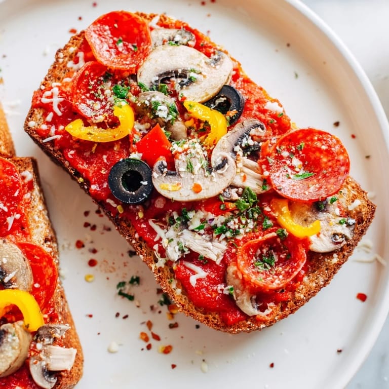 The key to toppings that don't fall off or create soggy spots is understanding that less is actually more—you're not making a deep-dish pizza, you're making toast with toppings, and the bread needs to support what you put on it. I learned this by overloading my early batches and watching mushrooms slide off mid-cook, so now I aim for a single balanced layer rather than a mountain of ingredients. Pepperoni is naturally salty and flavorful, so if you're using it, dial back the seasoning slightly—if you're doing vegetables, that's where oregano and extra seasoning shine.