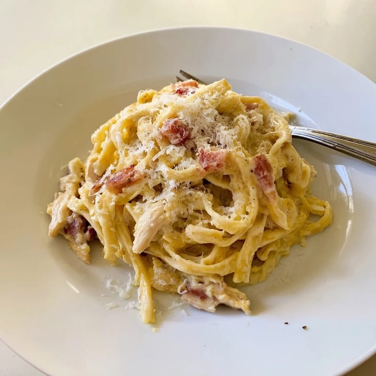 I made this for my sister after she moved into her first apartment, armed with nothing but a single pot and a dull knife. We stood shoulder to shoulder at her tiny stove, and when the sauce came together silky and glossy instead of clumpy, she actually gasped. That night, over mismatched bowls and cheap wine, chicken carbonara became her signature dish, the one she makes when she wants to impress a date or comfort herself after a long week.